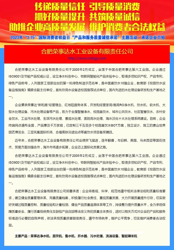 榮事達水工業公司將繼續做好產品和服務,以質量和口碑促進品牌魅力的持續提升,為更多消費者健康飲水提供優質服務。