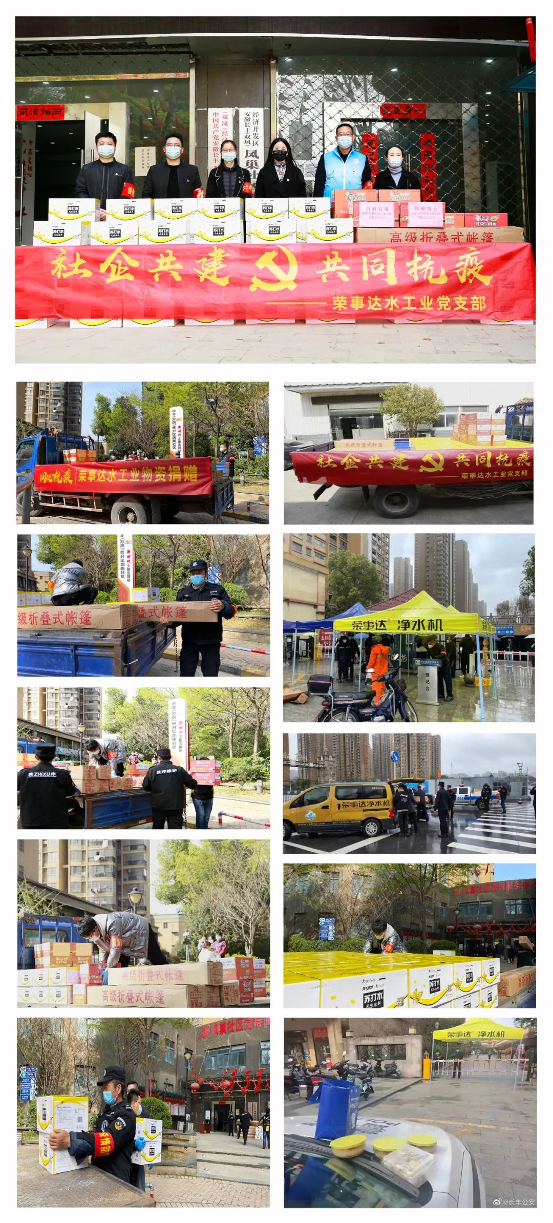 榮事達水工業集團在得知這一消息后,第一時間聯合黨支部來到長豐縣雙鳳開發區鳳巢社區黨群服務中心,為防控一線人員送去帳篷、方便面、飲用水等生活所需物資。