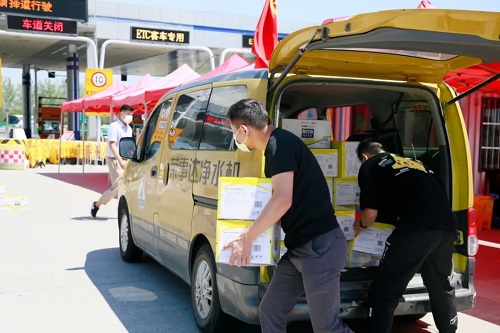 8月6日上午,團市委書記馬進偉、合肥市青年志愿者協會相關領導、榮事達水工業集團董事長雷鳴一行人來到蜀山高速道口看望正在辛苦奮戰在一線的青年志愿者們,為他們帶來了蘇打水、淡鹽水等飲品。